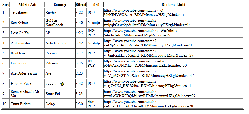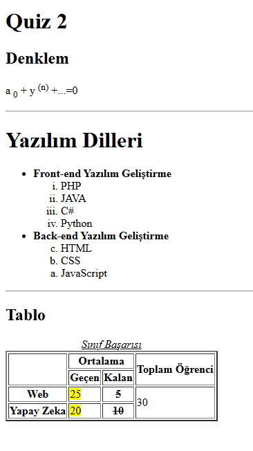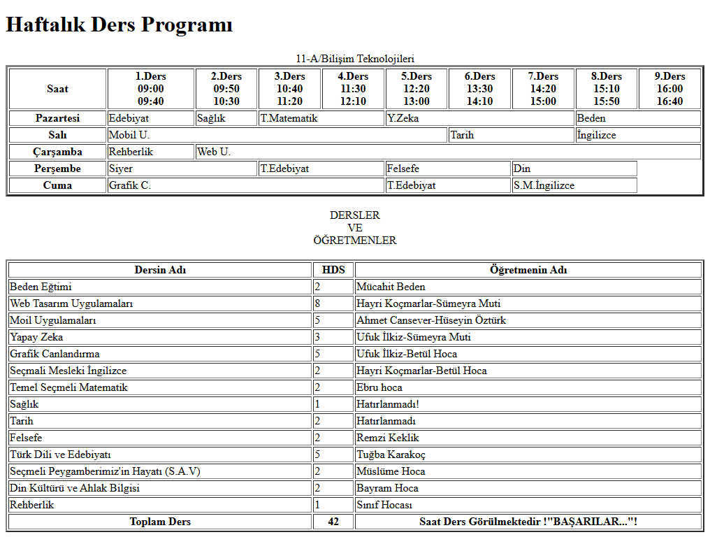 Tablo etiketi kullanularak ders programı yapılmıştır.