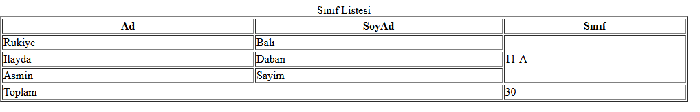 Tabloda satır ve sütunların mantığını anlamak için yapılmış bir örnek.